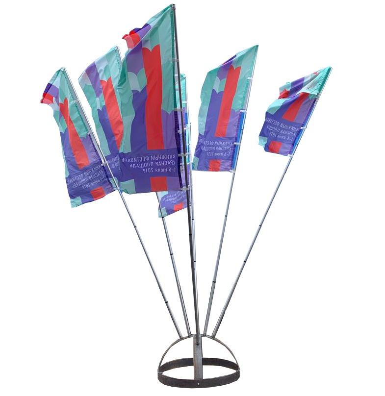 Конструкция "Флаговый костер" в аренду. Конструкция предоставляется в аренду с 9 штоками высотой от двух до 4,5 метров. Рекомендуемая ширина флагов 60 сантиметров, но вы можете использовать флаги до 85 сантиметров. Количество штоков на основании так же зависит от вашего пожелания - от 1 штуки до 9.